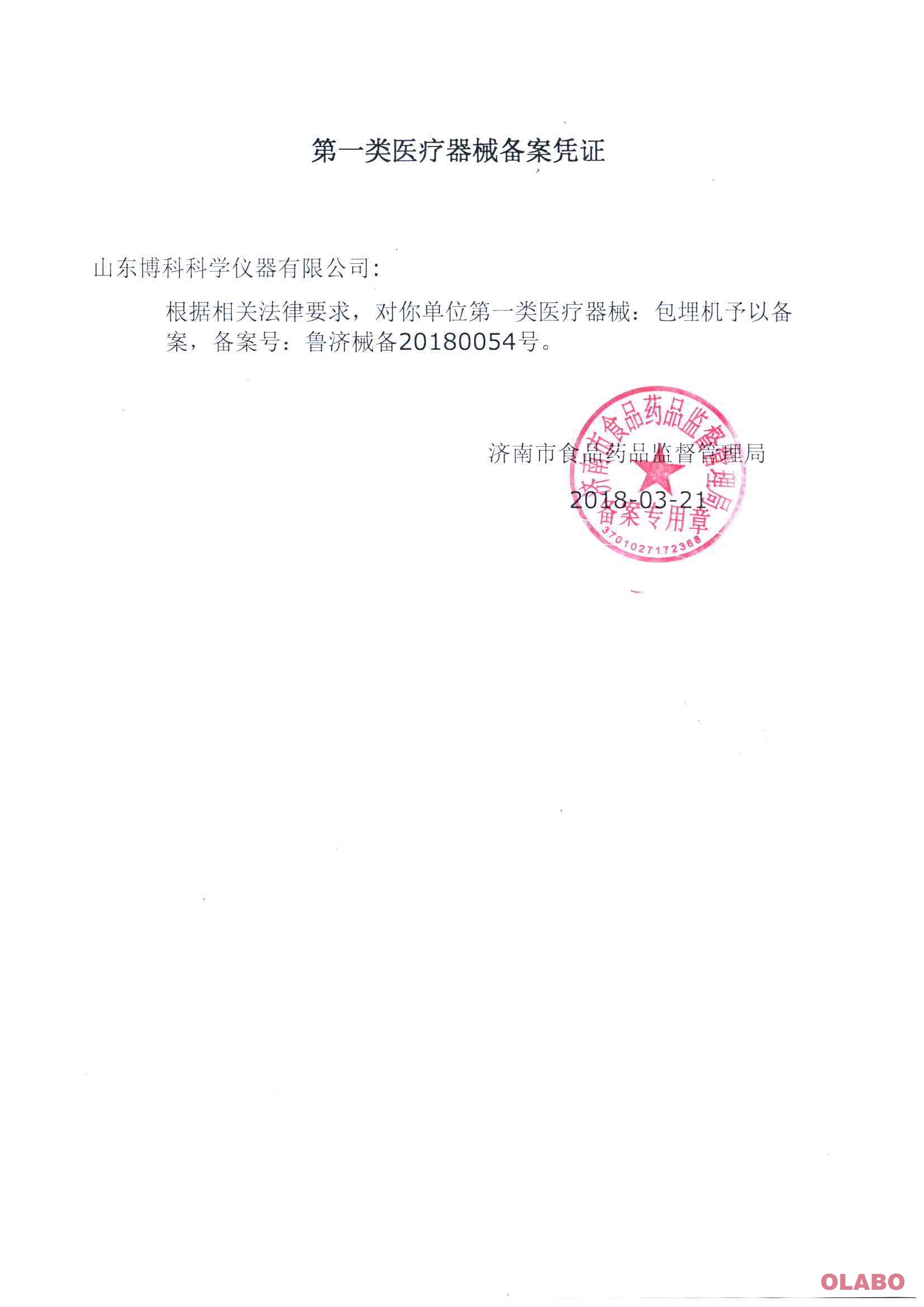 當前位置:首頁>新聞中心 > 新聞資訊> 熱烈慶祝山東博科科學儀器有限公司取得包埋機和染色機產品的備案憑證和備案信息表